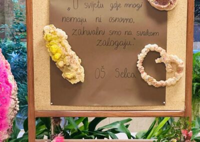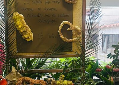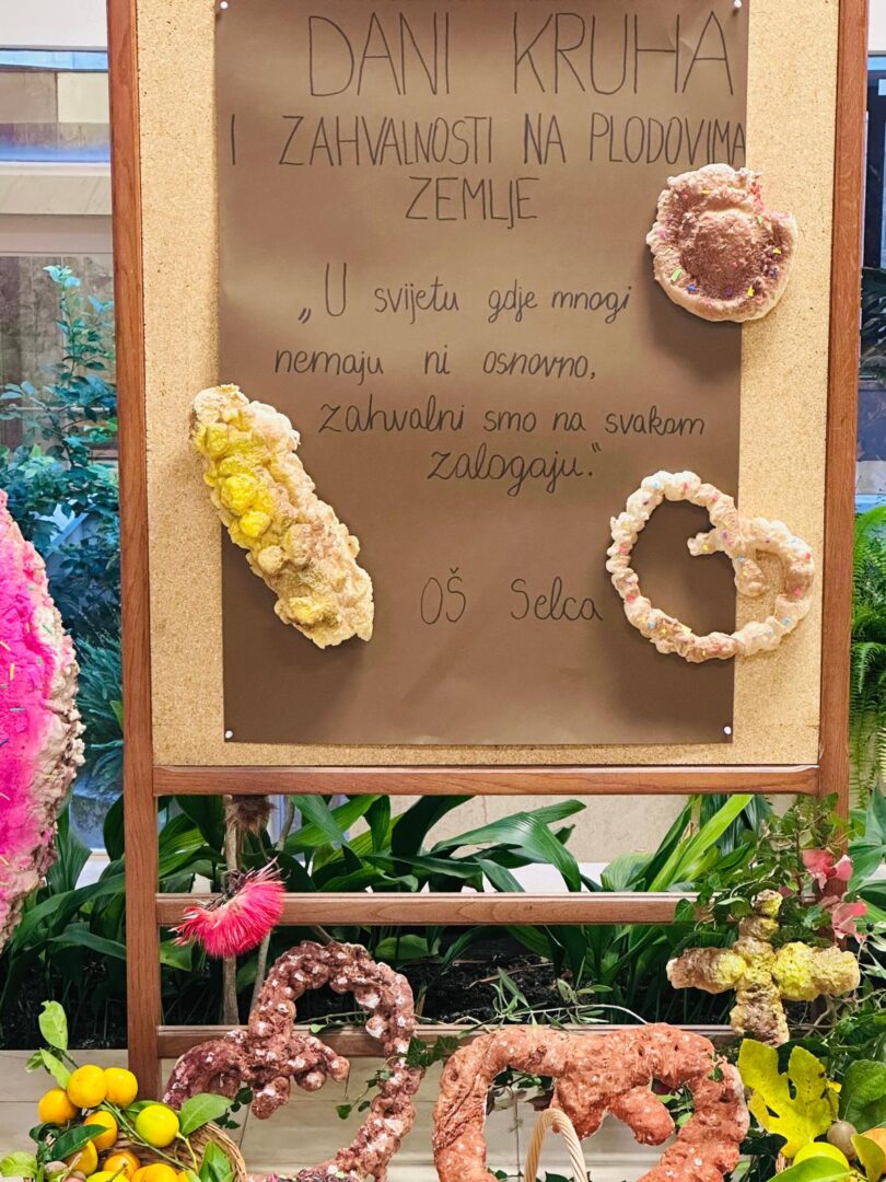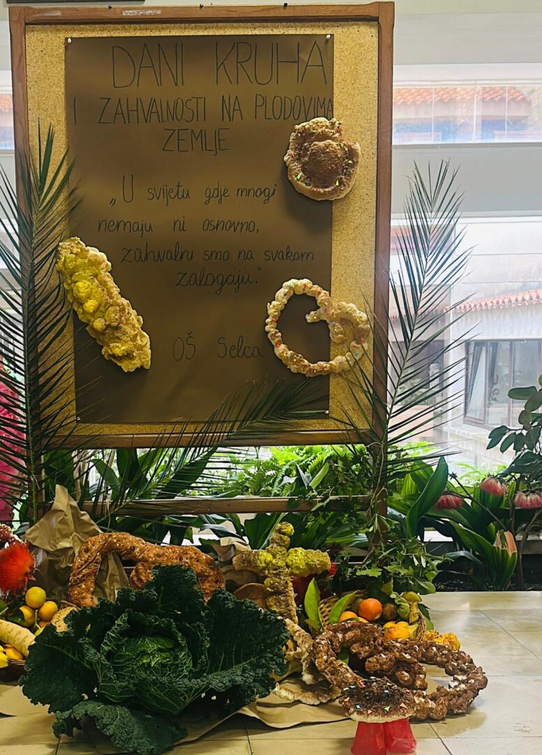 Dana 30. listopada u punom atriju naše škole obilježili smo Dane kruha i zahvalnosti za plodove zemlje. Uz prigodni program, pjesme i recitacije, kojim su nas obradovali učenici 2., 3., 4. i 6., zahvalili smo dragom Bogu kao i našim roditeljima, ukućanima i školskim kuharicama na hrani i domaćim plodovima koje nam svakodnevno pripremaju, ali i na svemu onome što nam pružaju i daruju. Župnici don Ivica i don Andro blagoslovili su obilje kruha te slatkih i slanih slastica, koje su napravile vrijedne ruke roditelja naših učenika. Od srca im hvala na tome! Program je završio skupnom izvedbom, svima dobro poznate pjesme, Zahvali (srcem prepunim). Bilo je to doista Jutro zahvalnosti!
