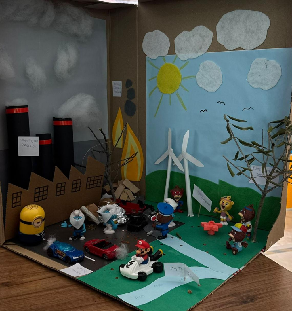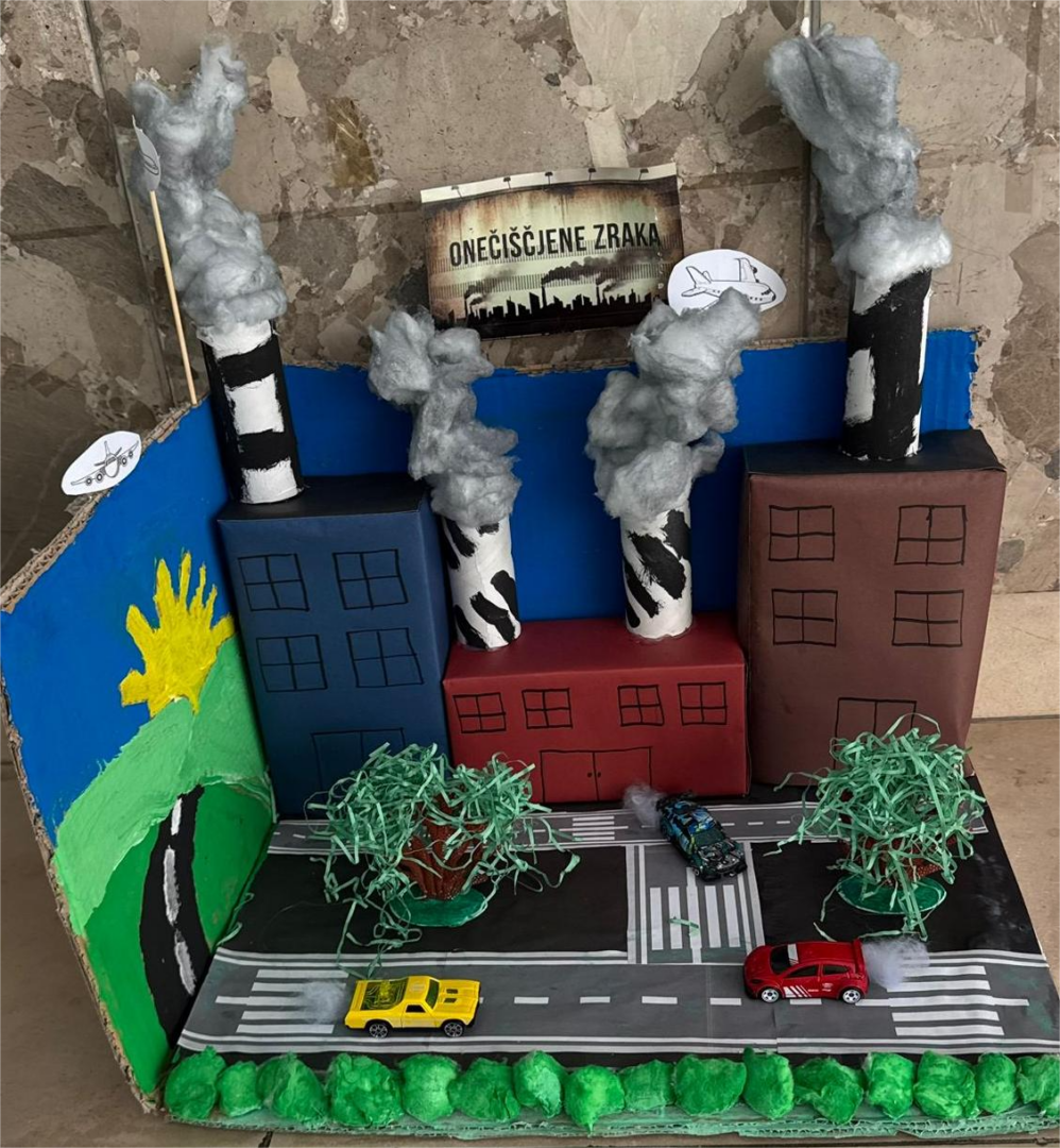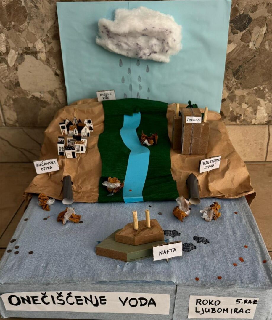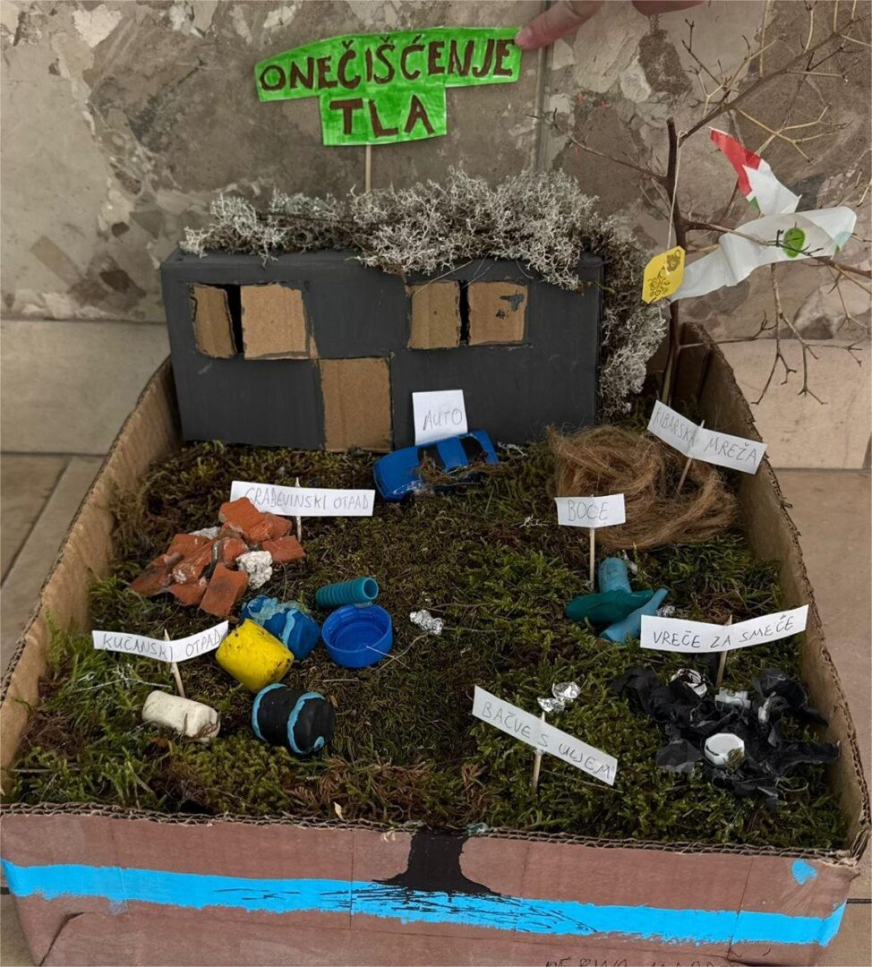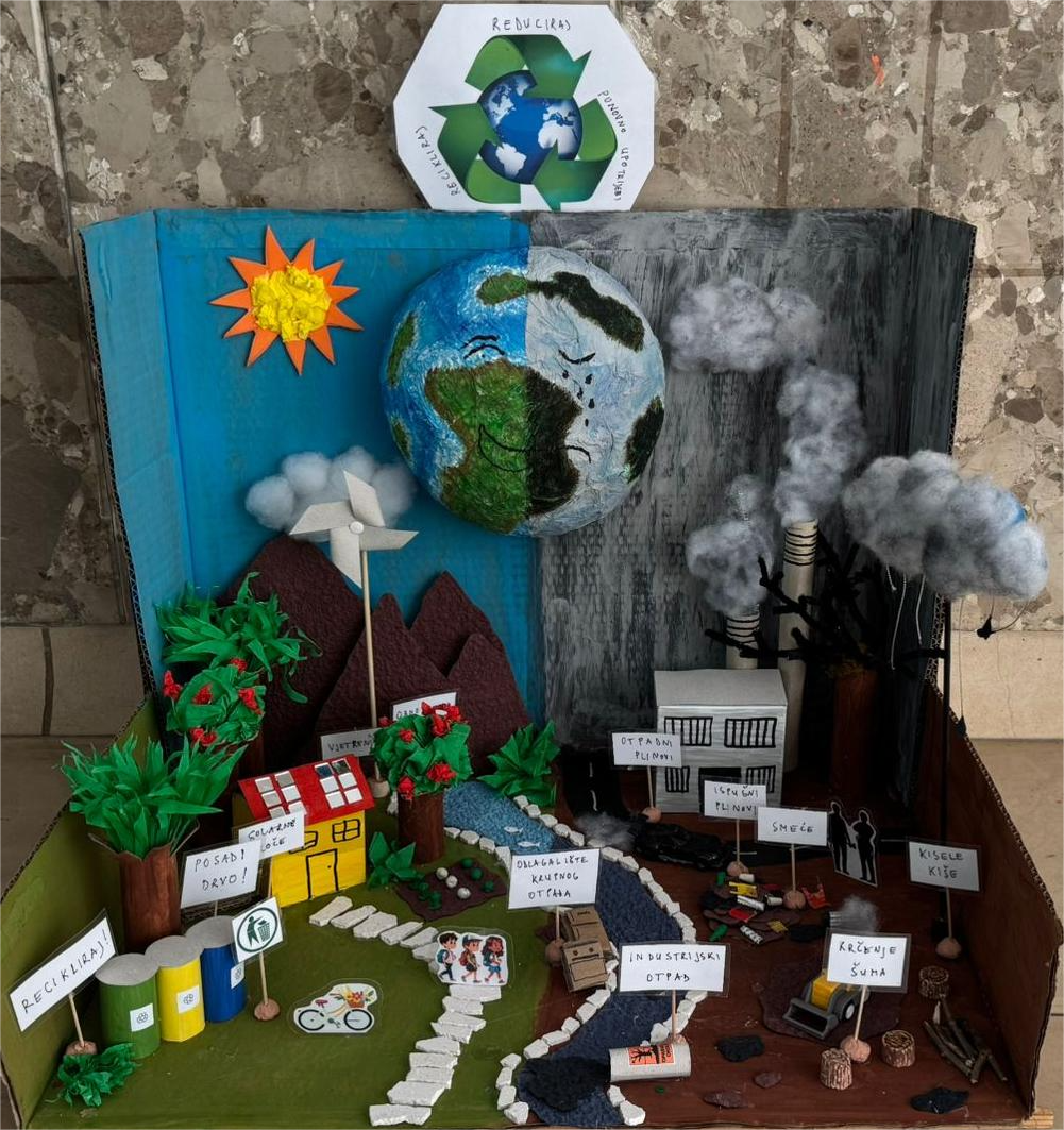 Učenici 5. razreda u sklopu predmeta Prirodoslovlje imali su za zadatak izraditi projekt kojim bi ostalim učenicima u školi prikazali globalni problem onečišćenja okoliša. Učenici su bili podijeljeni u tri grupe: jedna grupa je trebala prikazati problem onečišćenja zraka, druga grupa onečišćenje tla, a treća grupa onečišćenje vode. Učenici su u sklopu zadatka, projekt morali napraviti od recikliranih materijala i na taj način još jednom pokazati kako čuvati planet. Učenici su svojim radovima još jednom pokazali kako treba čuvati naš planet, prikazali su načine kojima možemo napravit planet boljim mjestom za život. Ostalim učenicima u školi izložba je bila jako zanimljiva te su i oni naučili nešto novo, a još jednom smo ih podsjetili kako trebamo čuvati planet, jer to je jedino mjesto koje nam nudi život, kako i stara poslovica kaže: „Čuvajmo Zemlju i prirodu na njoj, jer ih nismo naslijedili od svojih djedova i očeva, nego smo ih posudili od svojih potomaka“.