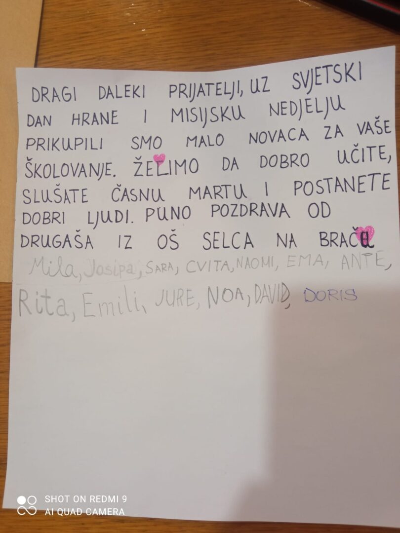 Drugaši su u listopadu obilježili Svjetski dan hrane i Misijski dan prikupljanjem financijske pomoći za školovanje djece u misiji na Solomonskim Otocima. Tamo više od desetljeća djeluju časne sestre milosrdnice sv. Vinka. Zahvaljujemo roditeljima koji su nam pomogli novčanim prilozima, a mi smo naučili koliko je važno dijeliti i pomagati potrebnima.