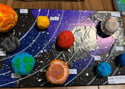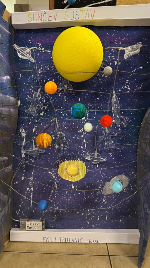 Izložbu učeničkih radova postavili smo u holu škole kako bi što više učenika moglo ponešto naučiti o nebeskim tijelima koja okružuju naš divan planet Zemlju.